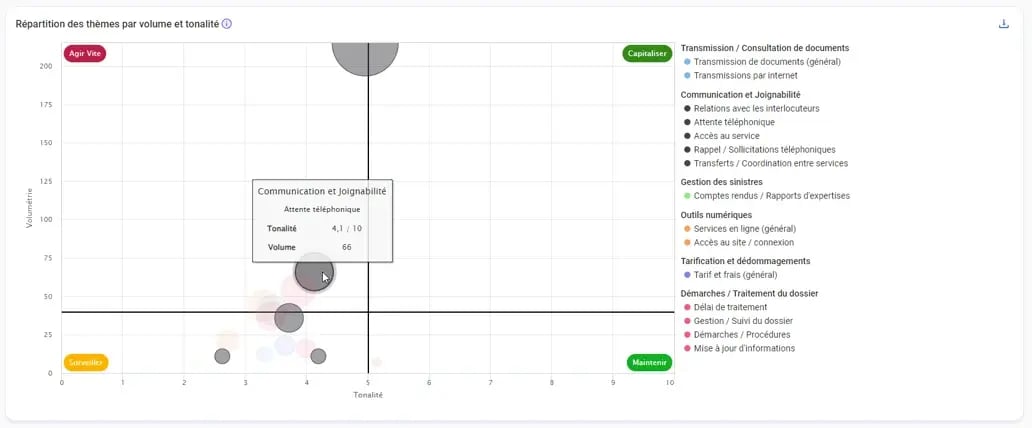 If you want to know at a glance which themes require your attention, you should use the matrix of themes distributed by volume and sentiment. This matrix is accessible through the Analysis submenu under the Dashboard menu.