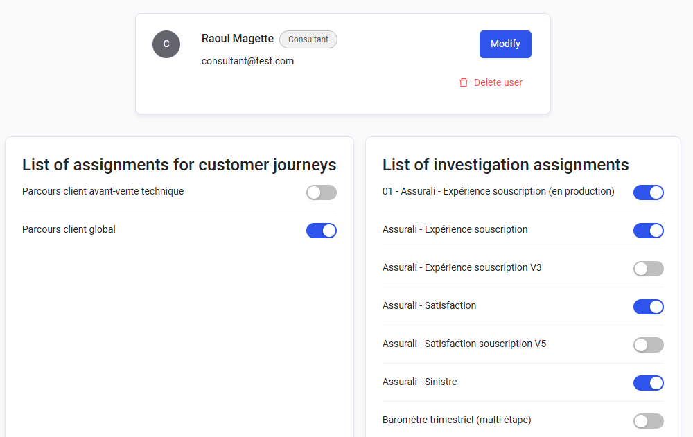 - For a consultant, their visibility rights on surveys 👉 check/uncheck the desired surveys.