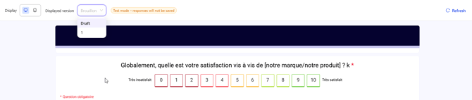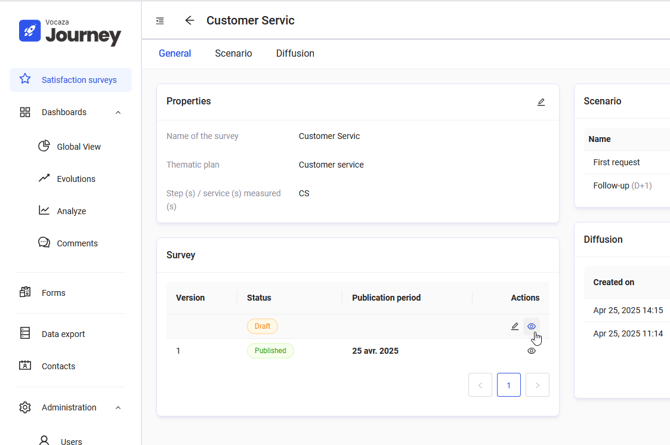 - From the General tab of a survey, click on the preview button (eye) of the survey version you wish to view.