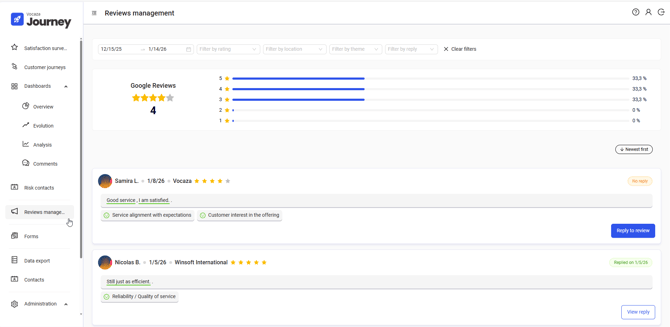 With this new feature, Journey enables you to centralize, analyze, and efficiently manage your Google reviews—even in a multi-location context—so you can better control your brand image and sustainably improve performance.