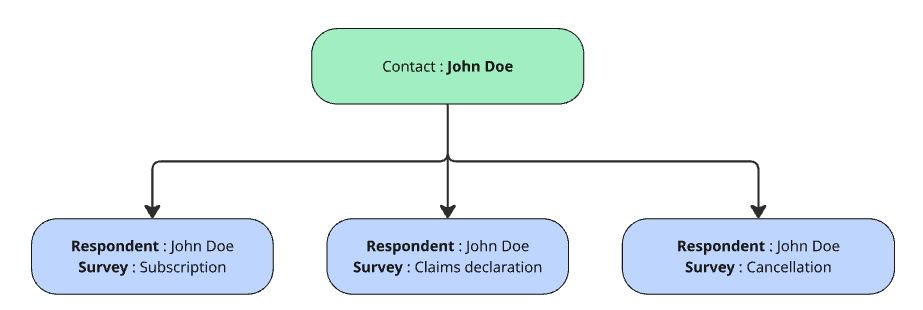 Example: I import Mr John Doe so that he can respond to my survey on subscription. Mr Doe's record is created and I can see that my company has asked him to complete the subscription survey. Later, I re-import the same John Doe into Journey to answer a cancellation survey. I'll find a single John Doe contact and in his contact form, I'll see his 2 requests.