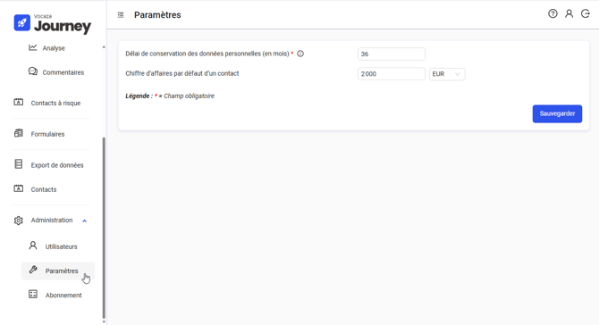 La durée de conservation peut être personnalisée par les Administrateurs, depuis l’écran Administration > Paramètres, entre 1 mois minimum et 60 mois maximum.
