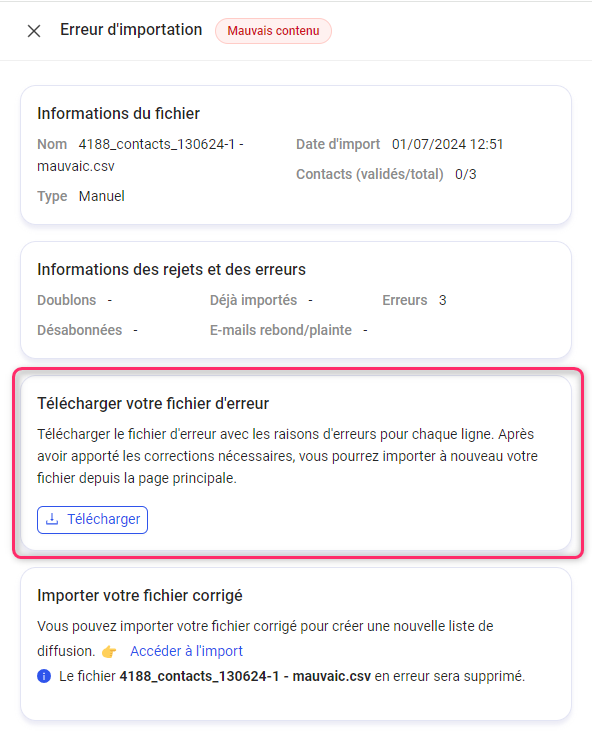 - Cliquez sur "Télécharger" dans la section "Télécharger votre fichier d'erreur" pour obtenir le fichier détaillant les erreurs spécifiques de l'import.