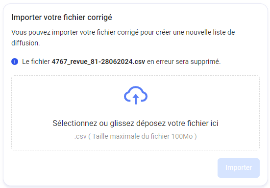 Pour qui avait été importé automatiquement, cliquez où glisser-déposer votre fichier corrigé dans la zone prévue à cet effet. Le fichier est automatiquement traité.