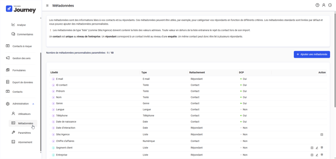 Elles viennent compléter les métadonnées standards proposées par défaut et facilitent la segmentation, l’analyse et le filtrage des résultats dans vos enquêtes et tableaux de bord.