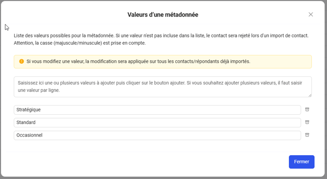⚠️ Les métadonnées de type "liste" (comme Site/Agence) doivent contenir la liste des valeurs admises. Toute valeur en dehors de la liste entrainera le rejet du contact lors de son import.