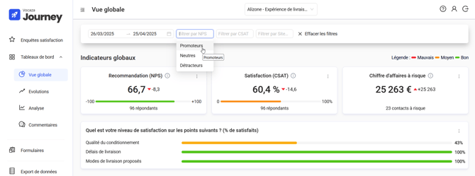 Lorsque vous êtes dans la partie tableaux de bord, vous pouvez filtrer les résultats pour vous concentrer sur une partie des retours clients, comme par exemple :