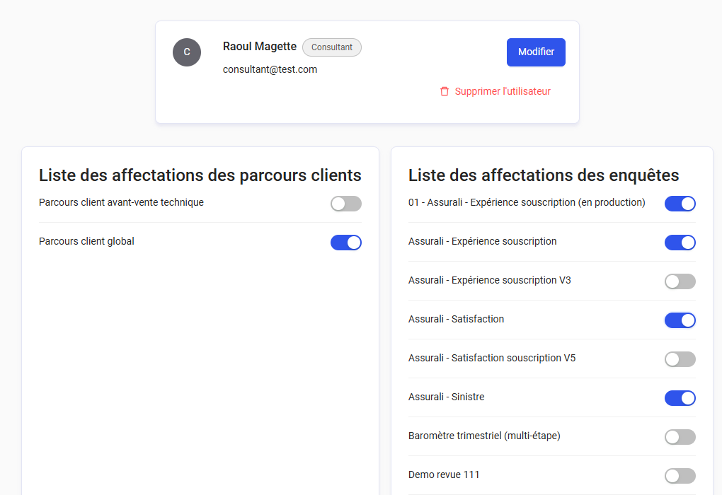 👉 Lorsqu’un consultant a accès à un parcours client, il ne peut visualiser que les enquêtes de ce parcours sur lesquelles il dispose déjà de droits.