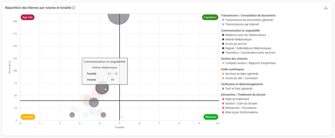Si vous souhaitez savoir d'un coup d'œil quel sont les thèmes sur lesquels vous devez porter votre attention, il faut utiliser la matrice de répartition des thèmes par volume et tonalité. Cette matrice est accessible via le sous menu Analyse du menu Tableau de bord.