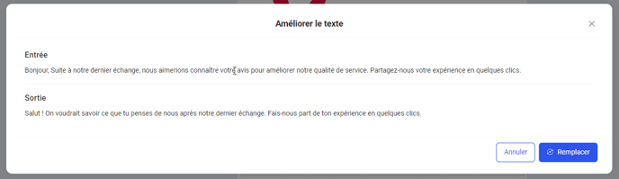 Une fois l'option sélectionnée, une fenêtre s'affiche avec le texte sélectionné et le texte proposé par l'IA. Vous pouvez alors remplacer tout le texte par celui proposé ou copier/coller la partie que vous souhaitez.