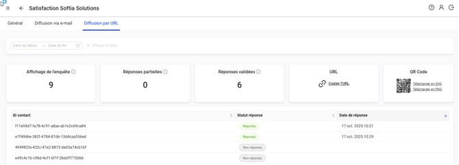 Une fois l’enquête diffusée, le suivi des statistiques est disponible dans votre tableau de bord :
