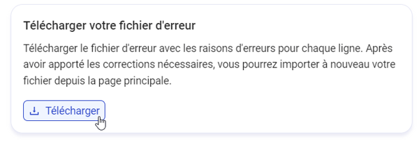 Le fichier d'erreur est disponible en cliquant sur l'import, oĂč vous pouvez tĂ©lĂ©charger votre fichier d'erreur depuis "TĂ©lĂ©charger votre fichier d'erreur" dans la fenĂȘtre qui s'ouvre Ă droite.