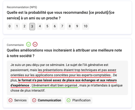 Soulignement des sous-phrases thématisées : Chaque sous-phrase analysée est désormais mise en évidence avec une couleur correspondant à sa tonalité, facilitant l’interprétation des retours clients ;