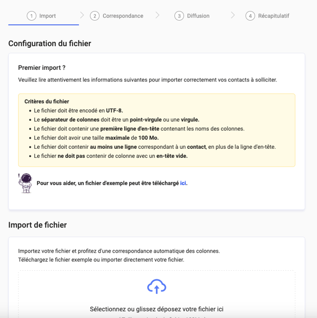 Mise à jour des imports : Les critères du fichier d'import ont été mis à jour pour préciser la possibilité d'utiliser le point-virgule ou la virgule comme séparateur. De plus, le fichier d'exemple d'import est désormais mis en avant pour faciliter son utilisation