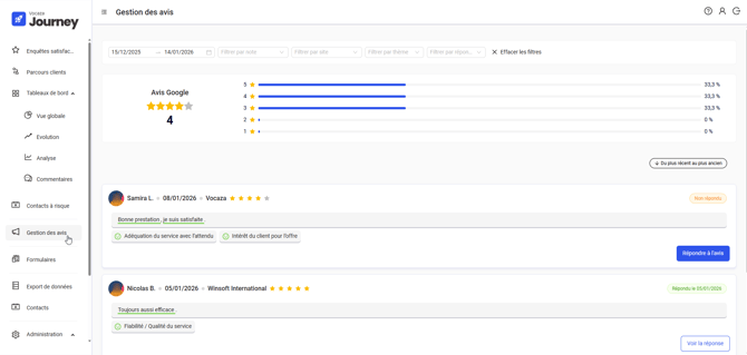 Avec cette nouvelle fonctionnalité, Journey vous permet de centraliser, d'analyser et de traiter efficacement vos avis Google, même dans un contexte multisites, afin de mieux maîtriser votre image et d'améliorer durablement vos performances.