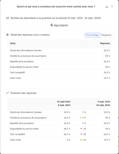 - L'évolution de chaque choix de réponse comparée à la période précédente.