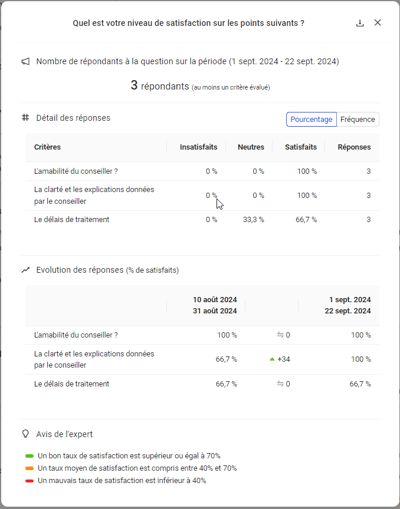 Nous avons enrichi la restitution des indicateurs de Satisfaction avec critères en ajoutant dans la pop-in de détail. L'évolution de chaque critère comparée à la période précédente.