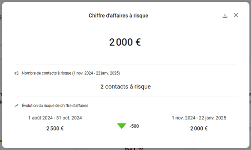 Ce nouveau widget permet de visualiser le chiffre d'affaires potentiel associé aux clients identifiés comme étant à risque. Il offre également une meilleure compréhension de l’impact financier lié à ces clients, permettant de prioriser efficacement les actions de rétention.